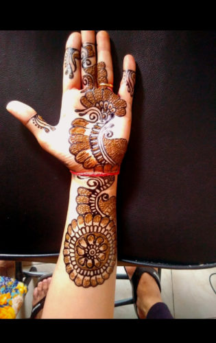 This is half hand mehendi design beautifully designed in black colour. It has shades of natural life and beautifully designed the nature in your hand. This designed is best suited to those who has broder wrist and palms and fair skin. However it is well suited for all skin type and will come beautiful when come full.