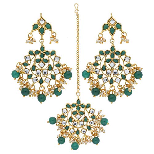 - GRACEFUL & FLAWLESS: Give yourself that beautiful look and make others jealous with our Earrings & Maang Tikka. It has a high quality Imitation Emerald Green Stones along with unique American Diamond look alike which gives it an edge over other earrings. This is a one of a kind design which will go with all types of Dresses.