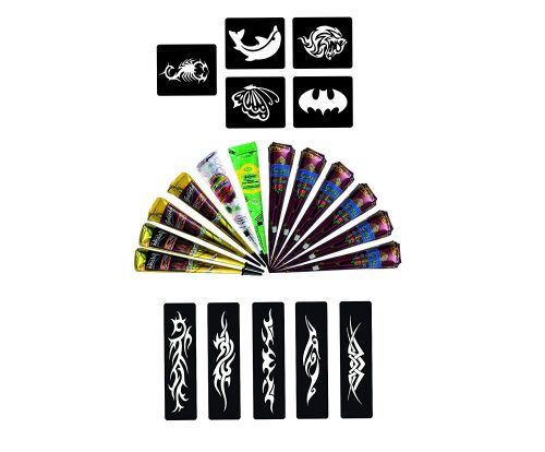 - Each pack contain: 12 mehndi cones and 10 piece different stencils